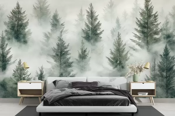 Wall murals Beautiful forest with pine trees, fog, nature landscapes, green colors Nr. w02222