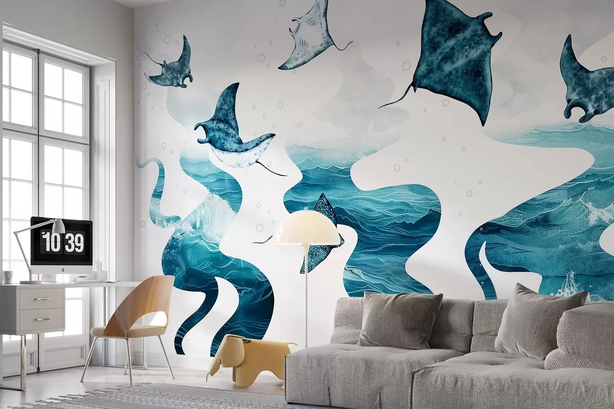 Wall murals Manta ray fish, watercolor style, sea, ocean, blue colors Nr. w02266