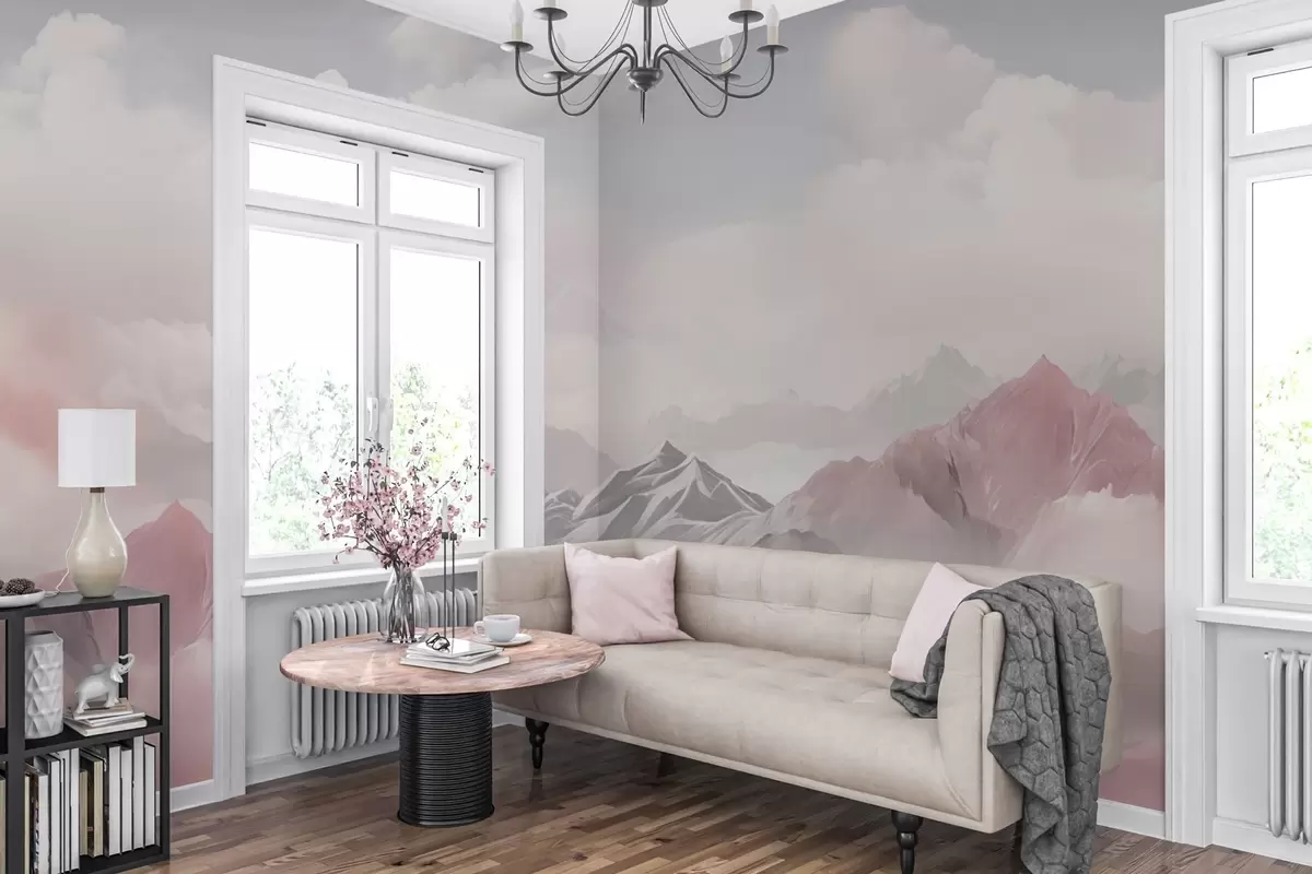 Wall murals Pink mountains in fog and puffy clouds Nr. w02296