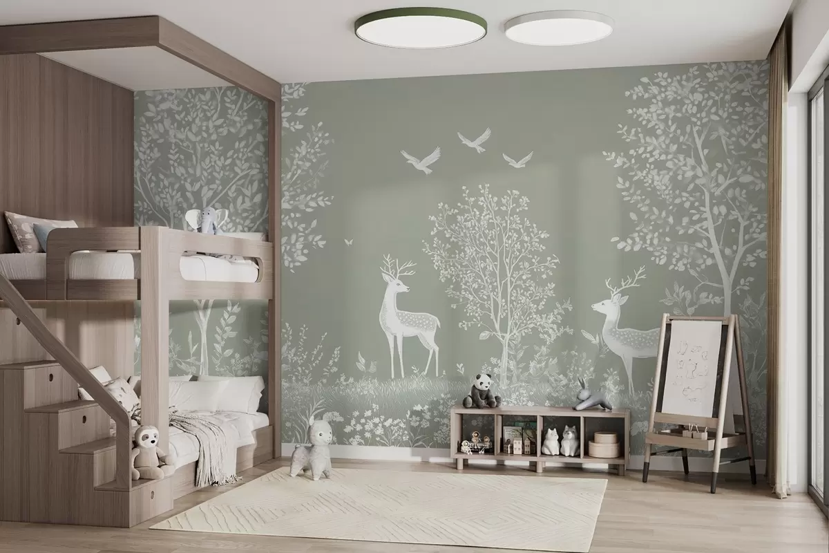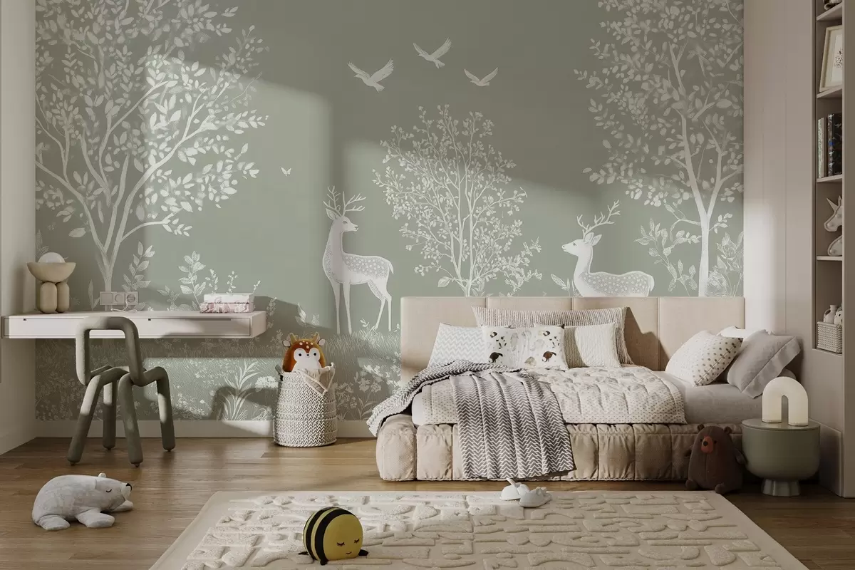 Wall murals forest with deer in the style of a chalk drawing on an olive background Nr. w02444v1