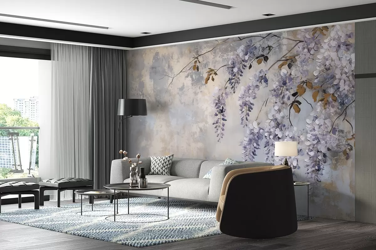 Wall murals textured wallpaper in soft, muted colors with delicate wisteria flowers and branches. Nr. w02451