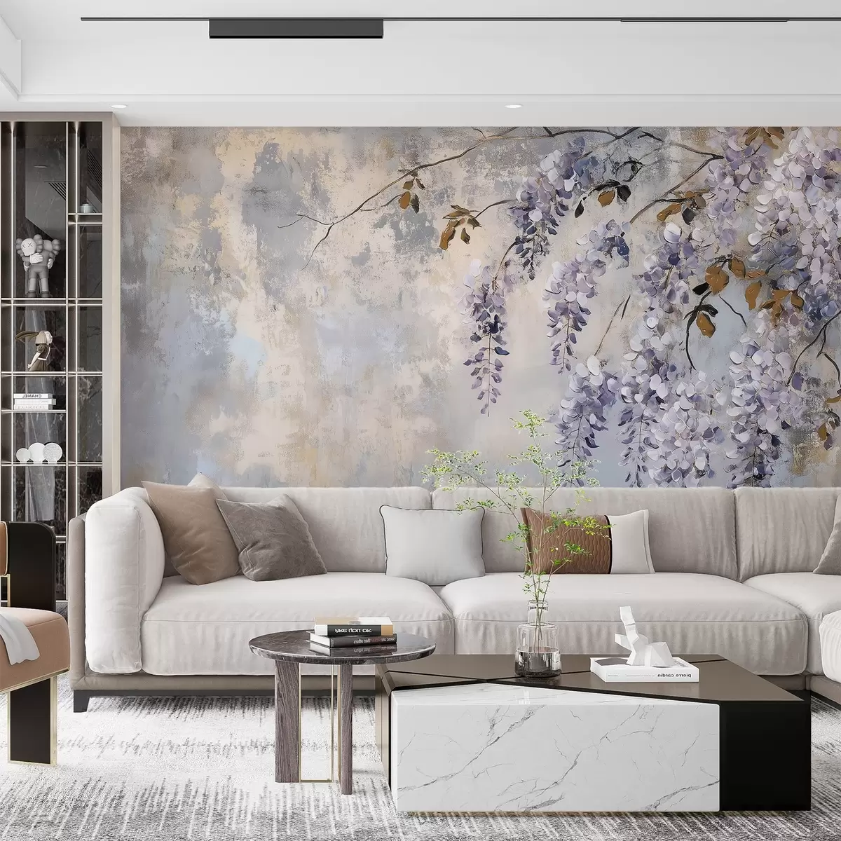 Wall murals textured wallpaper in soft, muted colors with delicate wisteria flowers and branches. Nr. w02451