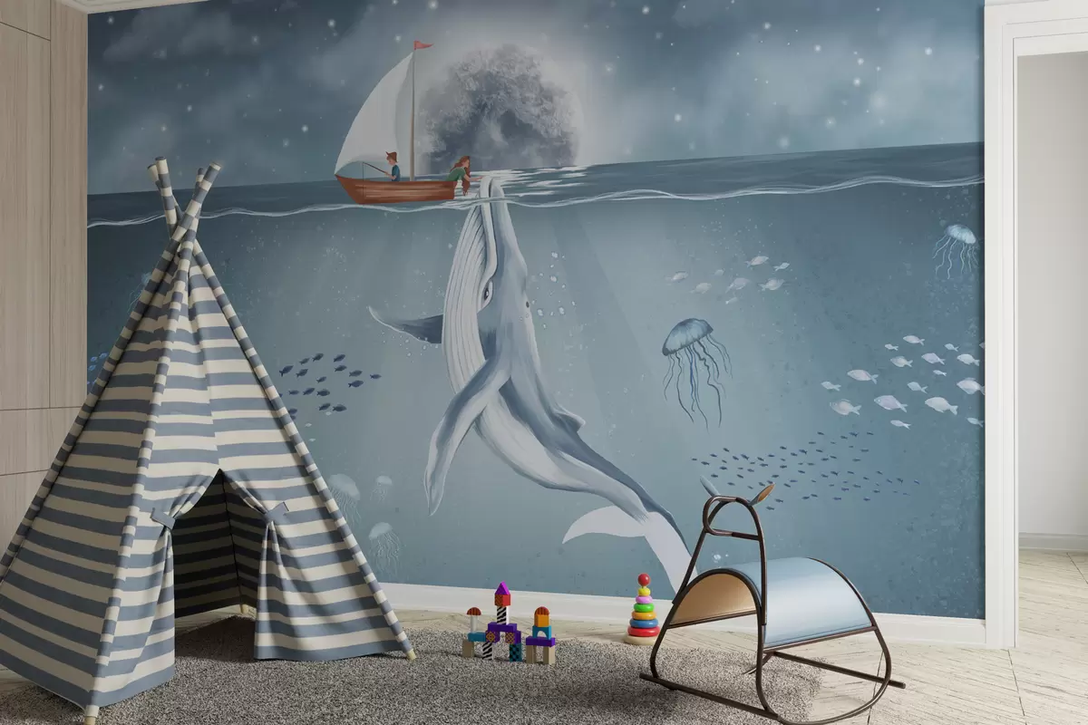 Wall murals Children's design with whale, moon and boat with children Nr. w02476