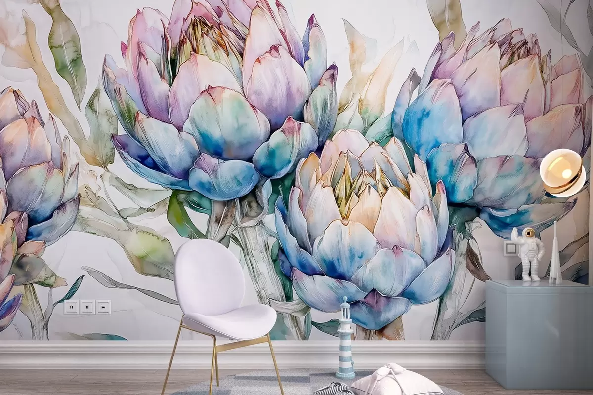 Wall murals Artichokes drawing, watercolor style, floral, purple, beige, green Nr. w02484