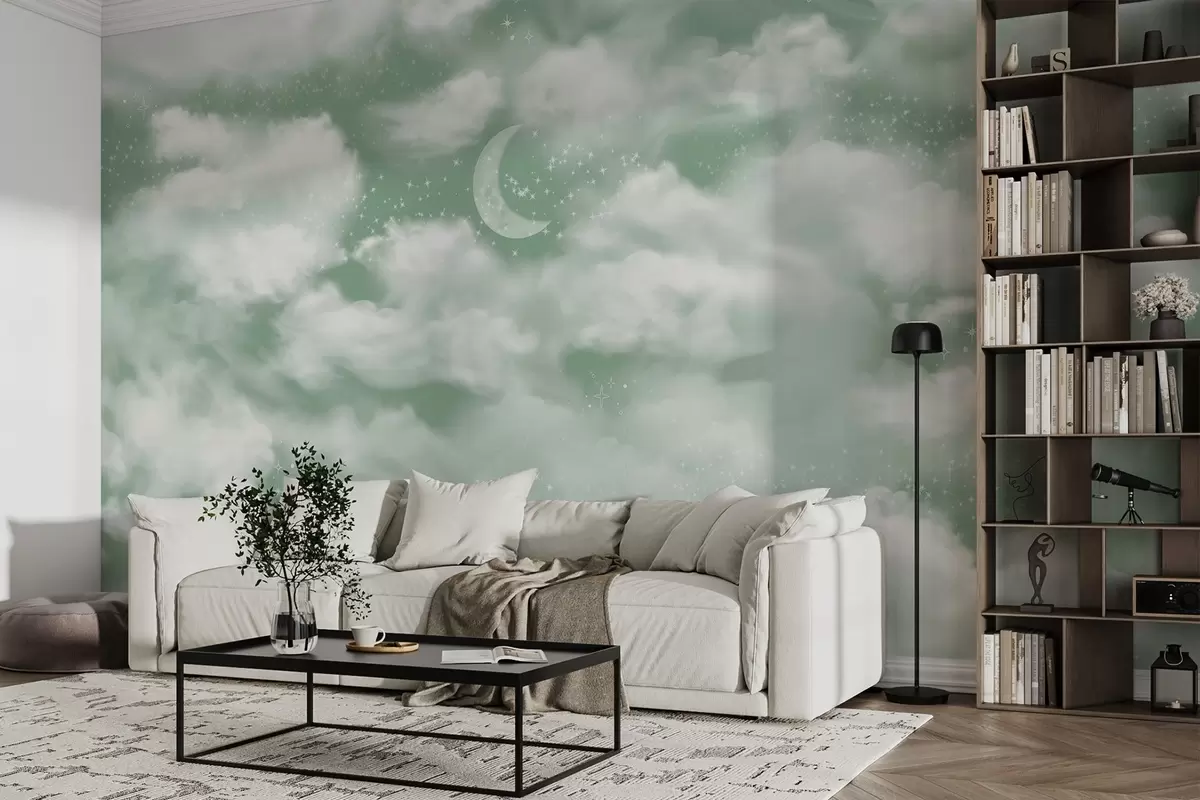 Wall murals Starry sky with moon and clouds, dreamy, ethereal, soft green colors Nr. w02515v2