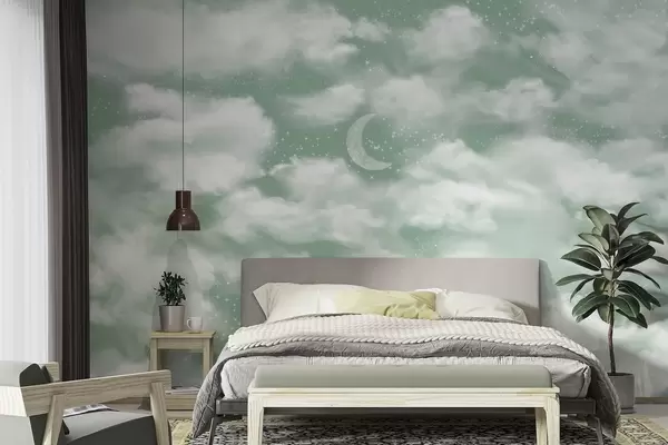 Wall murals Starry sky with moon and clouds, dreamy, ethereal, soft green colors Nr. w02515v2