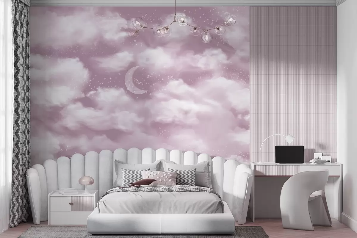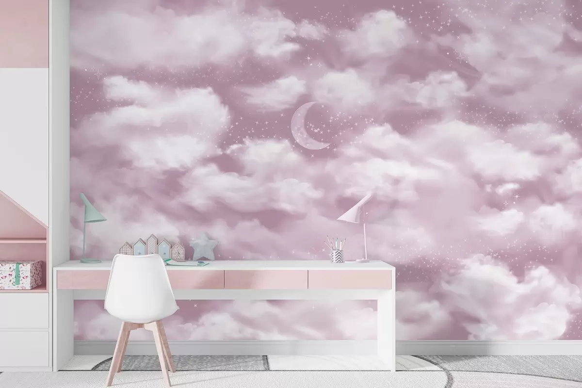 Wall murals Starry sky with moon and clouds, dreamy, ethereal, soft pink colors Nr. w02515v3