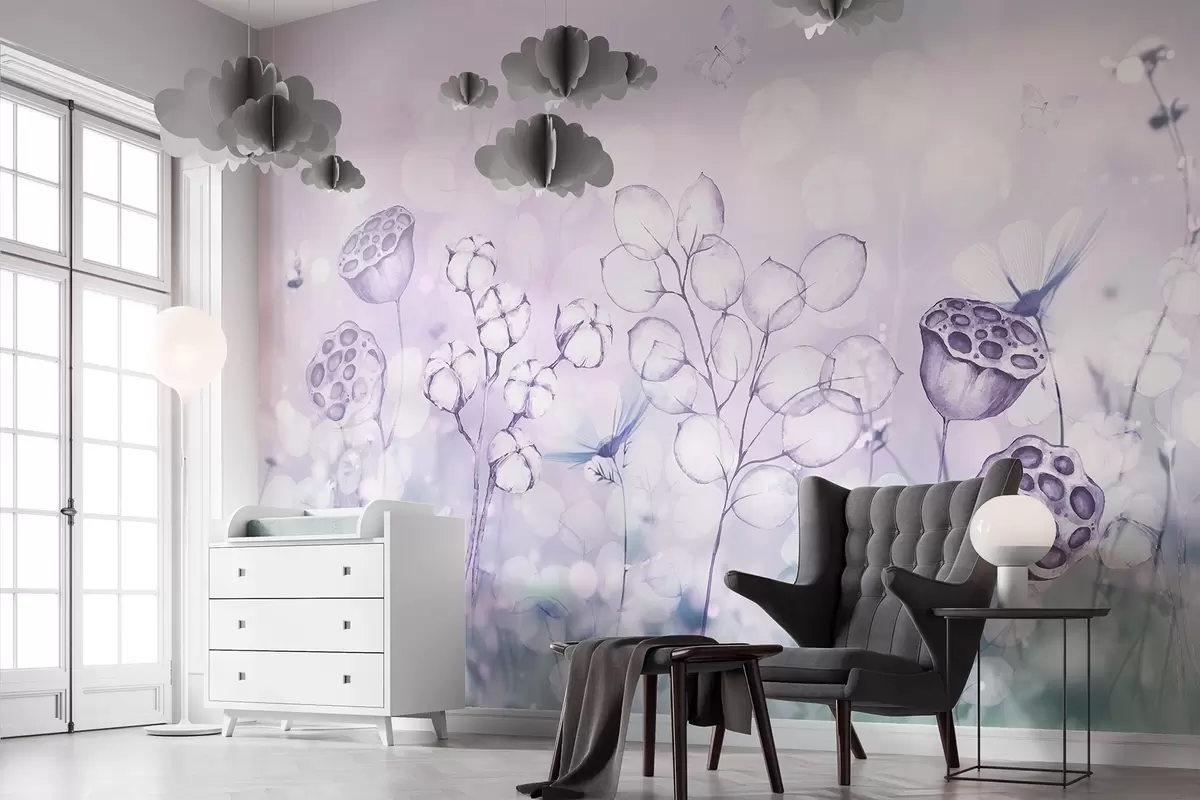 Wall murals Dreamy flower garden, butterfly, cotton flowers, lotuses, purple colors Nr. w02516v1