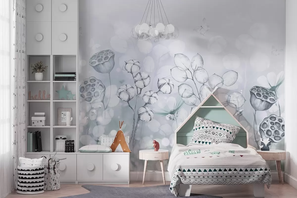 Wall murals Dreamy flower garden, butterfly, cotton flowers, lotuses, grey colors Nr. w02516v2