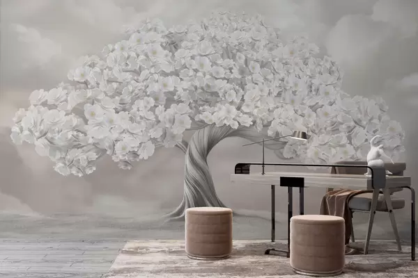 Wall murals Large tree in flowers with clouds in the background in pastel colors Nr. w02748v1