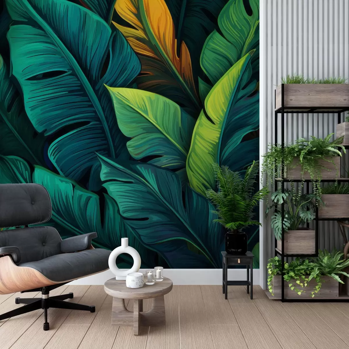 Wall murals Vibrant tropical leaves with deep green, bluish, and orange hues Nr. w03078
