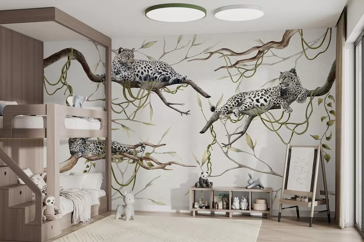 Wall murals Leopards on the jungle trees, lianas, tropical, wild animals, pastel color pallete Nr. w03146v4