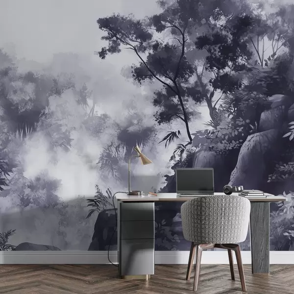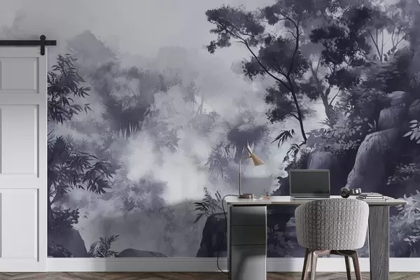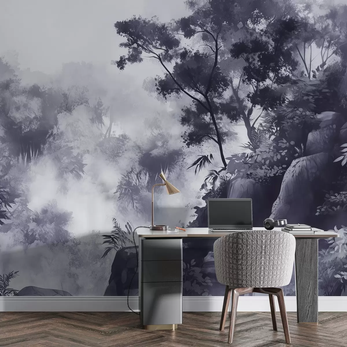 Wall murals Oriental landscape, jungle, trees, watercolor style, grey colors Nr. w03149v1