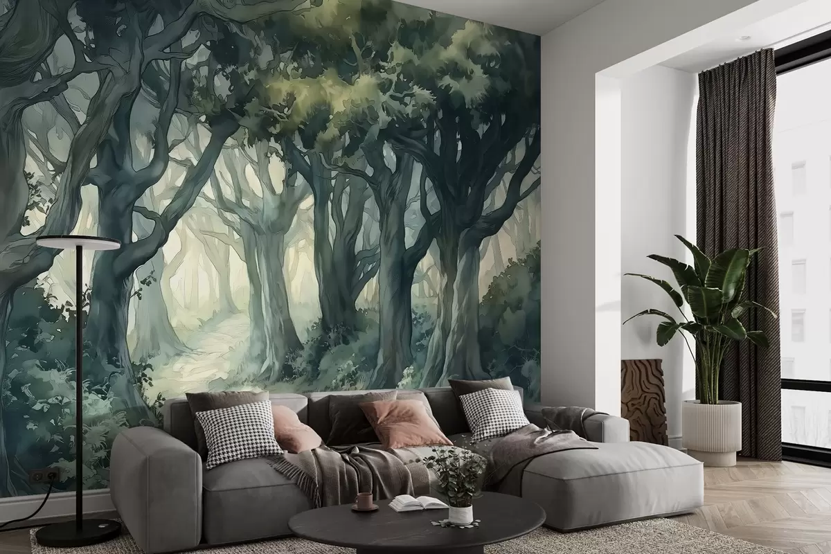Wall murals Forest with big trees, green color spallete, watercolor style drawing Nr. w03150
