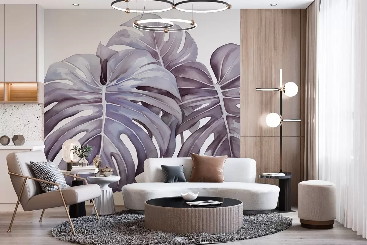Wall murals Big monstera leaves, tropical plants, watercolor style drawing, violet colors Nr. w03151v1