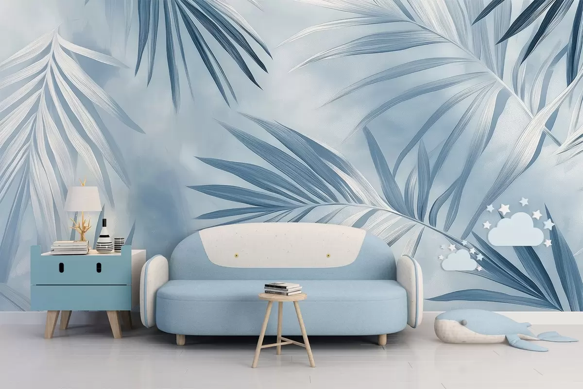 wall murals Tropical leaves abstraction, palm tree, blue color palette w03153