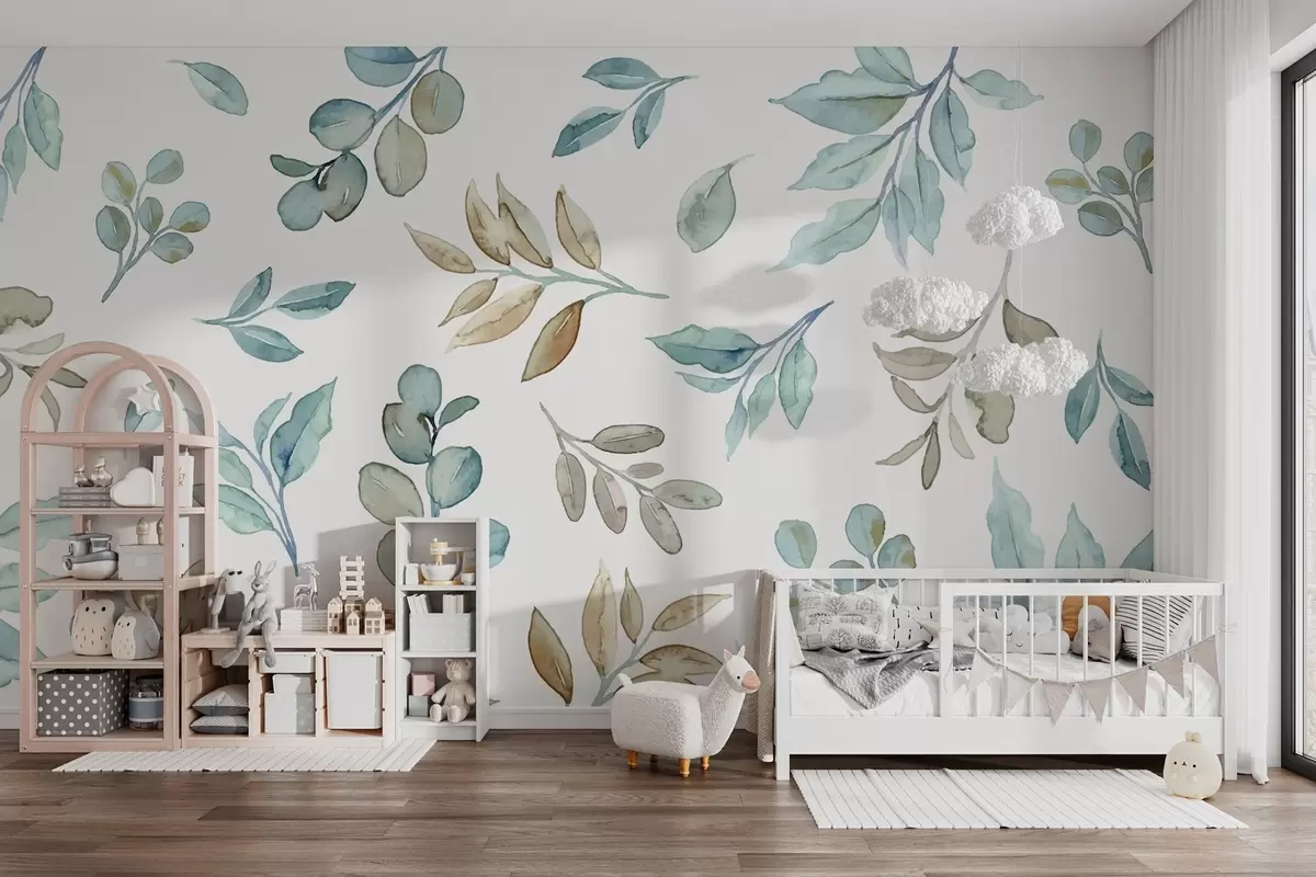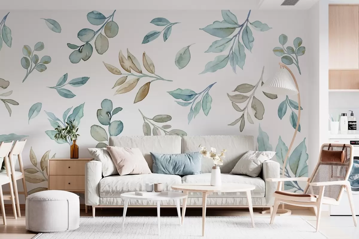 Wall murals various leaves and branches in watercolor technique in blue and beige tones on a white background Nr. w03280