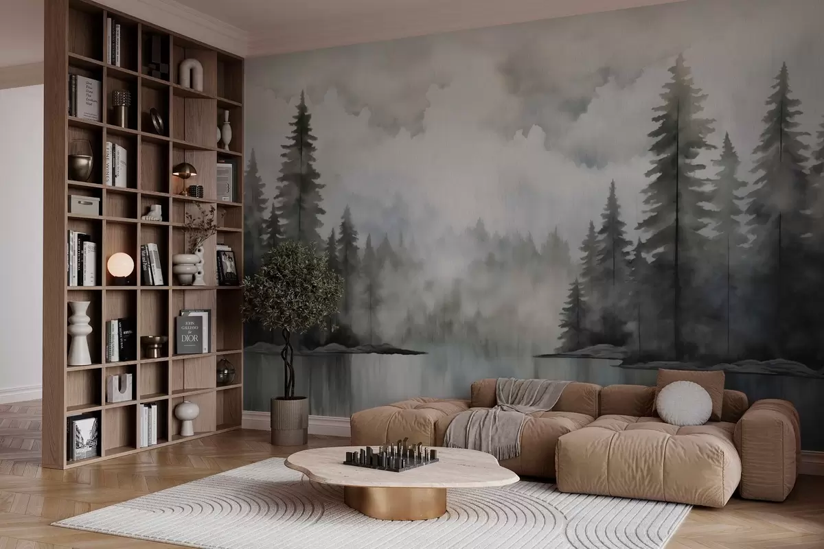 Wall murals Forest, lake and cloudy sky in watercolor style Nr. w03387