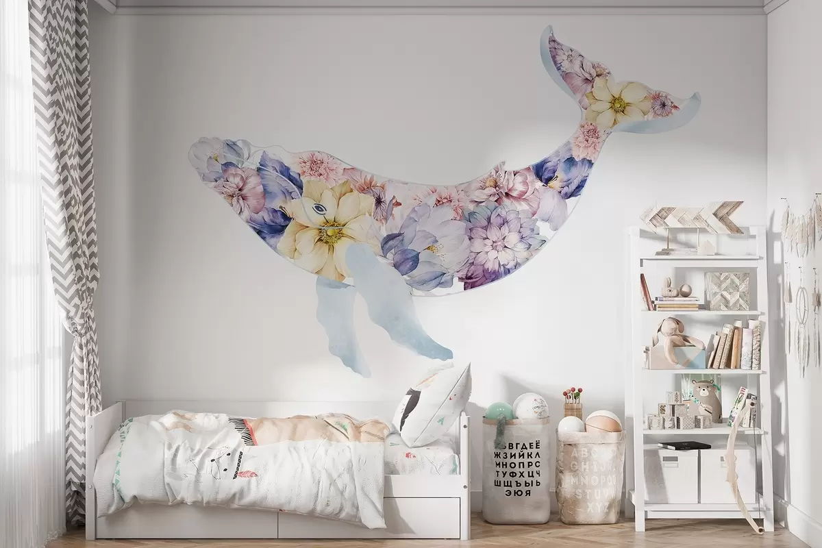 Wall murals Beautiful whale with watercolor flowers, sea animals, colorful Nr. w03445