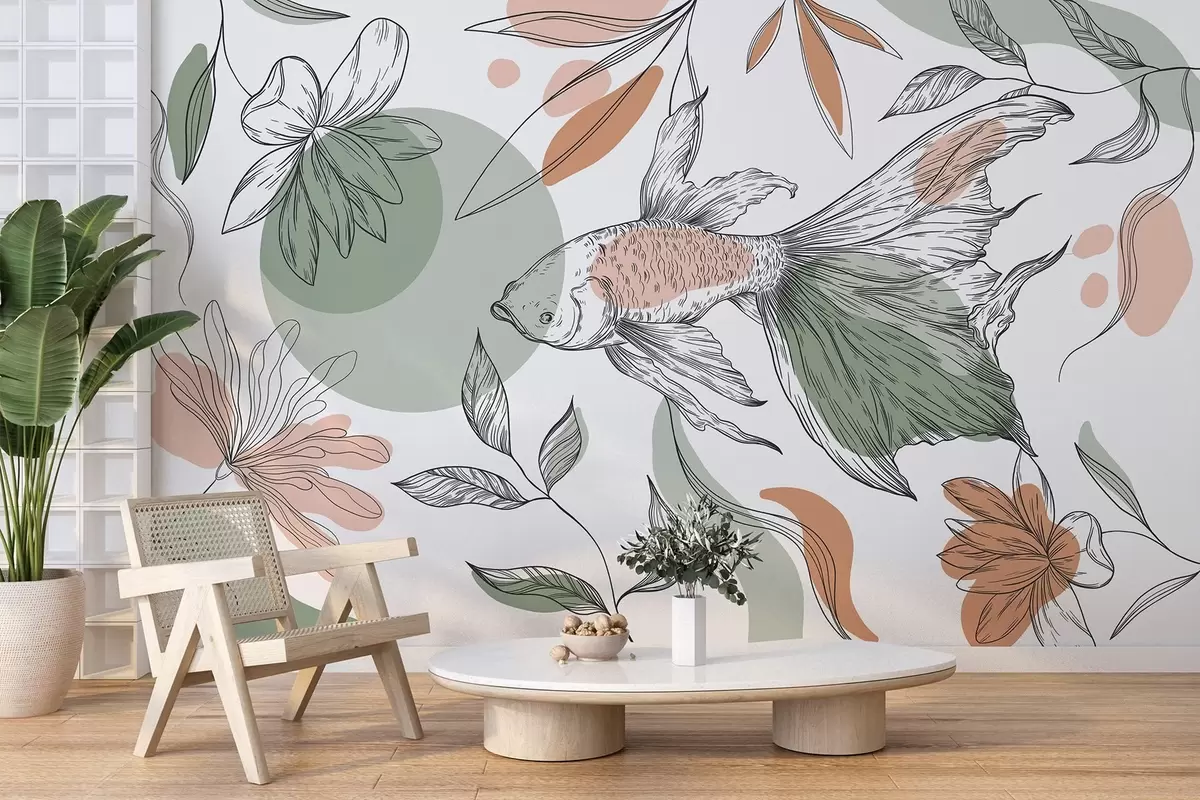 Wall murals Line drawing fish with flowers, minimalism, marine, floral, natural colors Nr. w03448