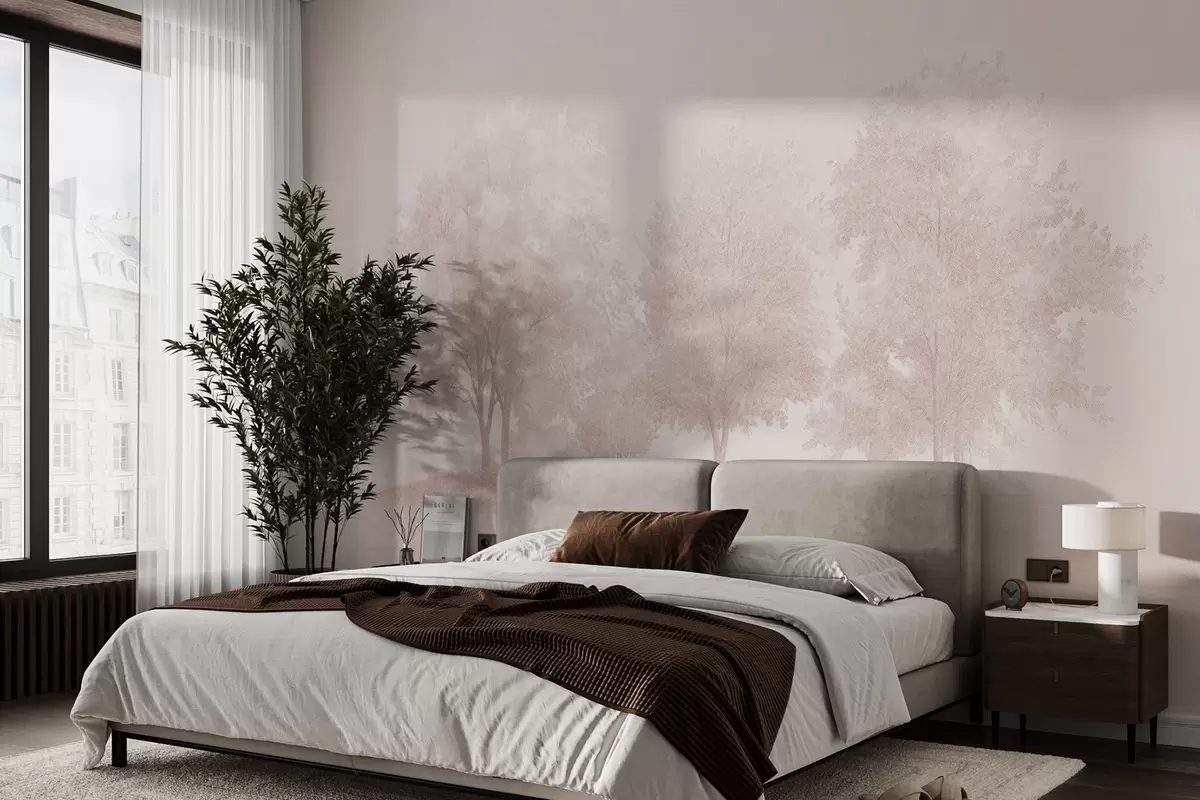 Wall murals Blossom trees, spring, pencil style drawing, pink colors, nature Nr. w03549