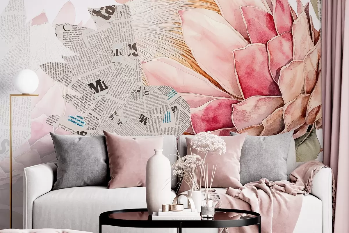 Wall murals Protea flowers, newspaper art, floral, tropical, natural colors Nr. w03667
