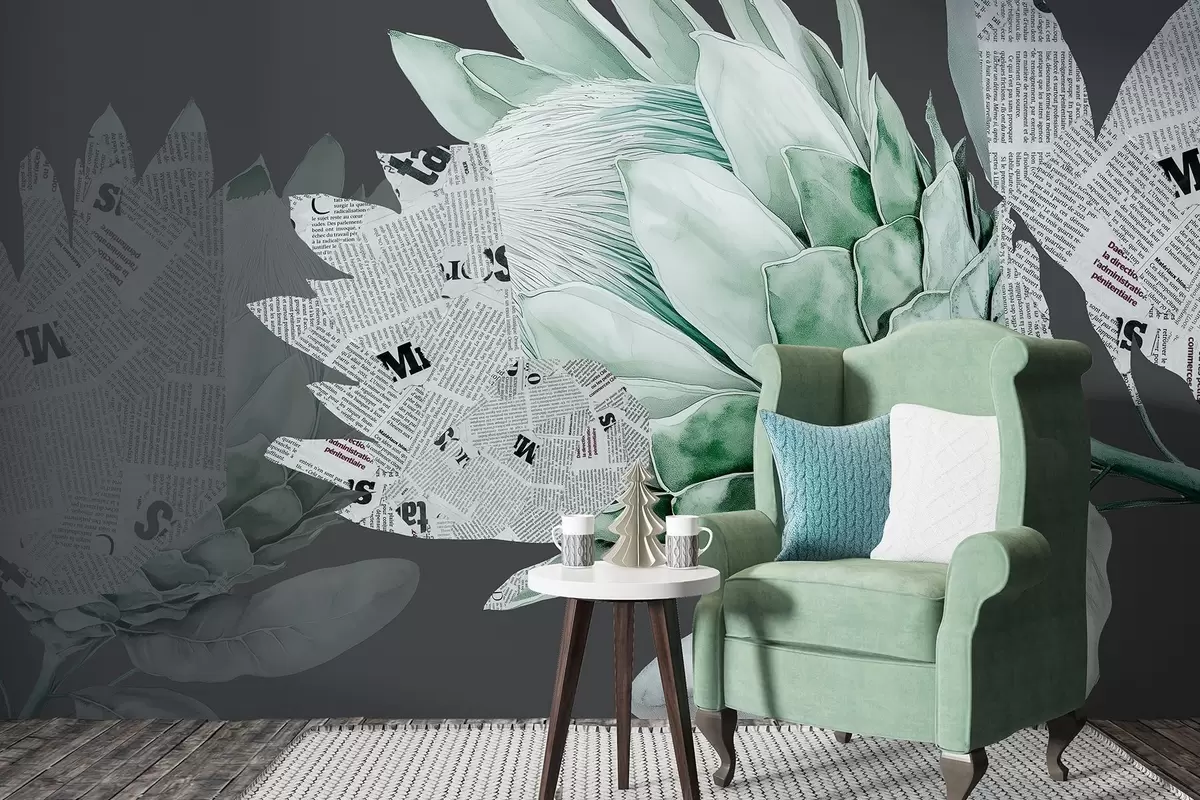Wall murals Protea flowers, newspaper art, floral, tropical, dark background, green colors Nr. w03667v3