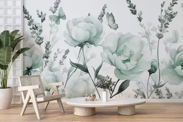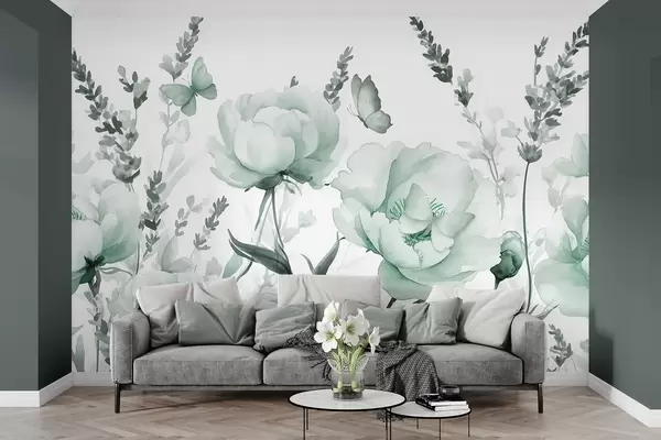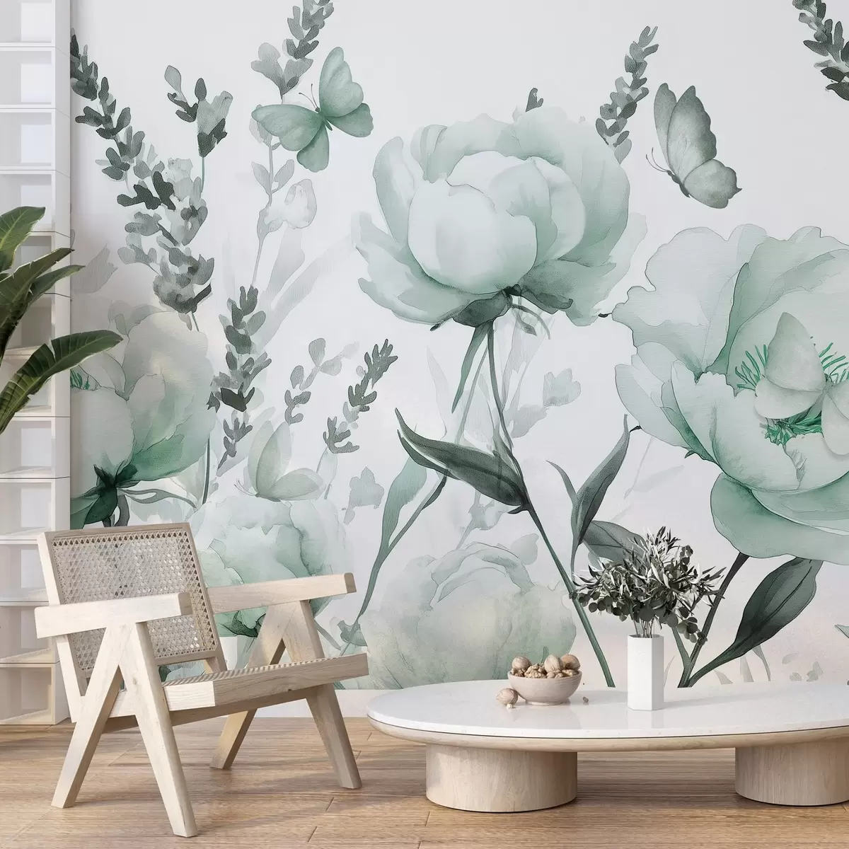 Wall murals Flower meadow, peonies, lavender, butterflies, watercolor style, green colors Nr. w03668v1