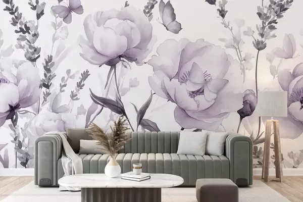 Wall murals Flower meadow, peonies, lavender, butterflies, watercolor style, puple colors Nr. w03668v3