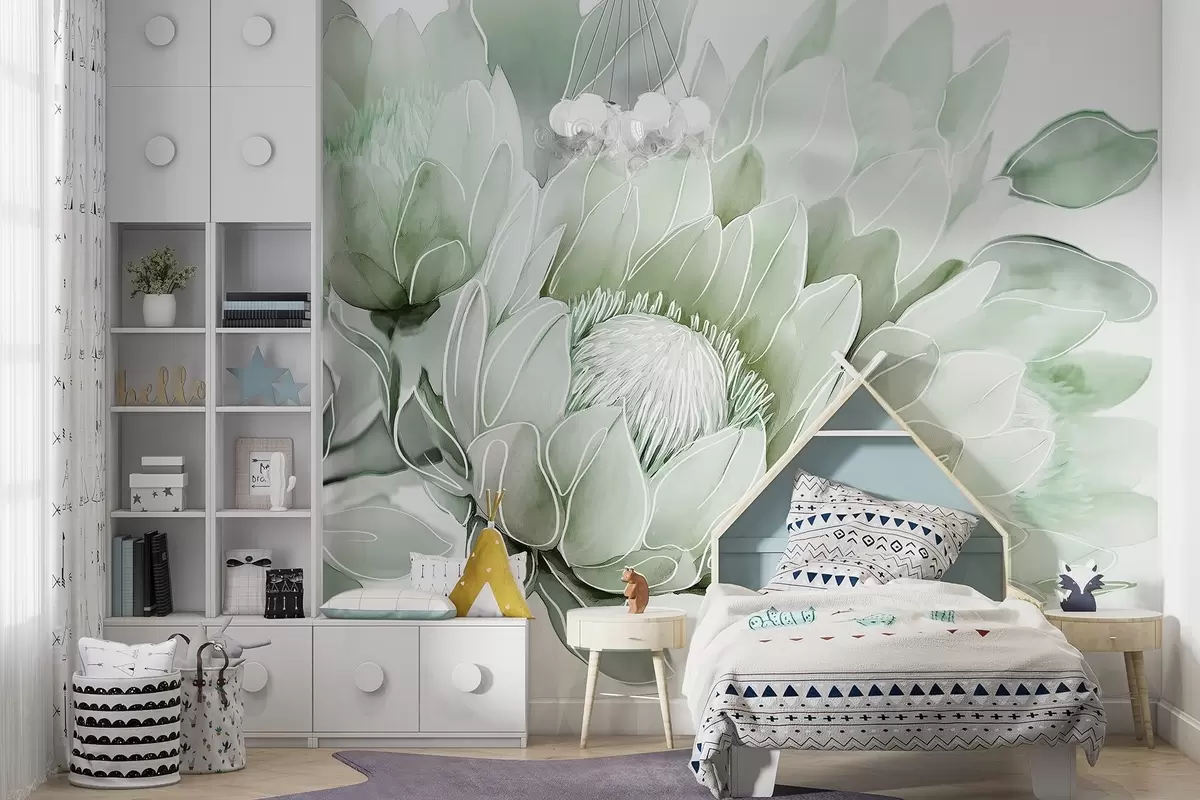 Wall murals Beautiful protea flowers, line art drawing, tropical, green colors Nr. w03669v2
