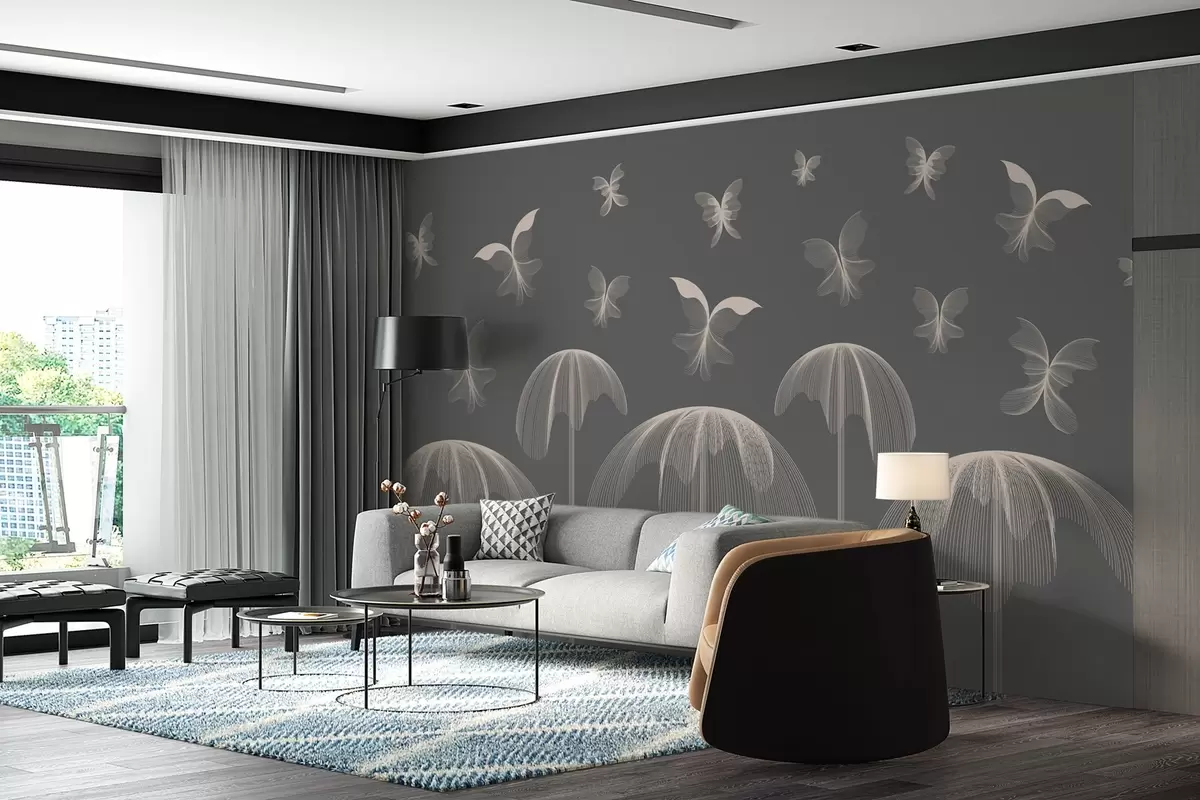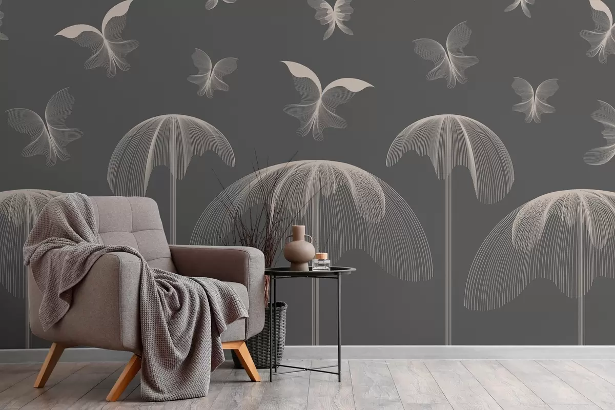 Wall murals minimalist linear wallpaper butterflies and fountains on a dark gray background Nr. w03762v1