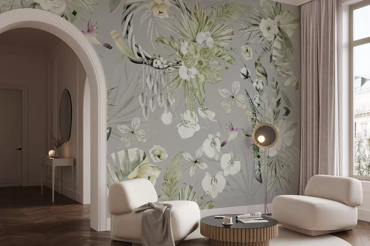 Wall murals Boho style ornament with peony flowers and birds, watercolor style, green colors Nr. w03885v2