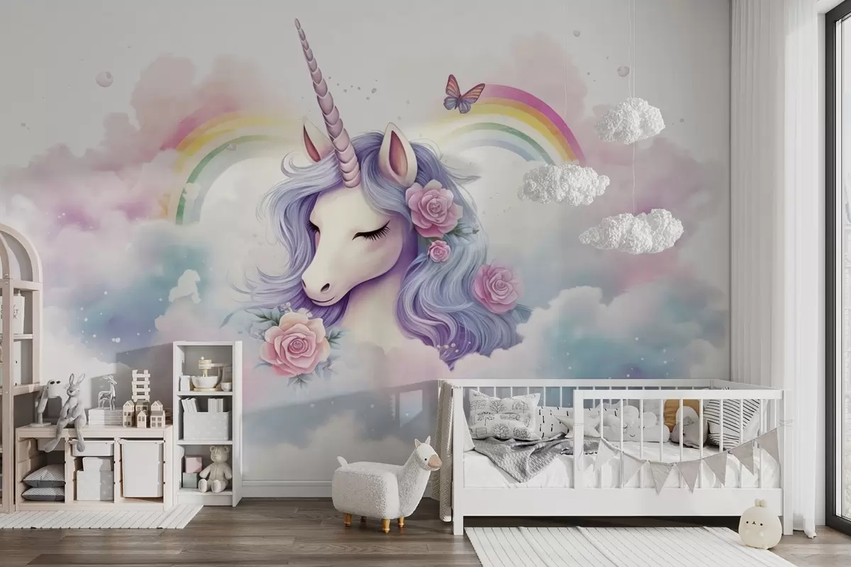 Wall murals Pastel unicorn in clouds with rainbow and roses Nr. w03990