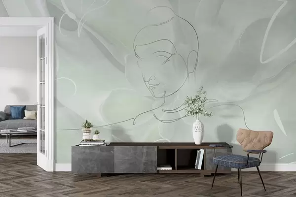 Wall murals Floral abstraction with Buddha line drawing, green colors Nr. w04004v3