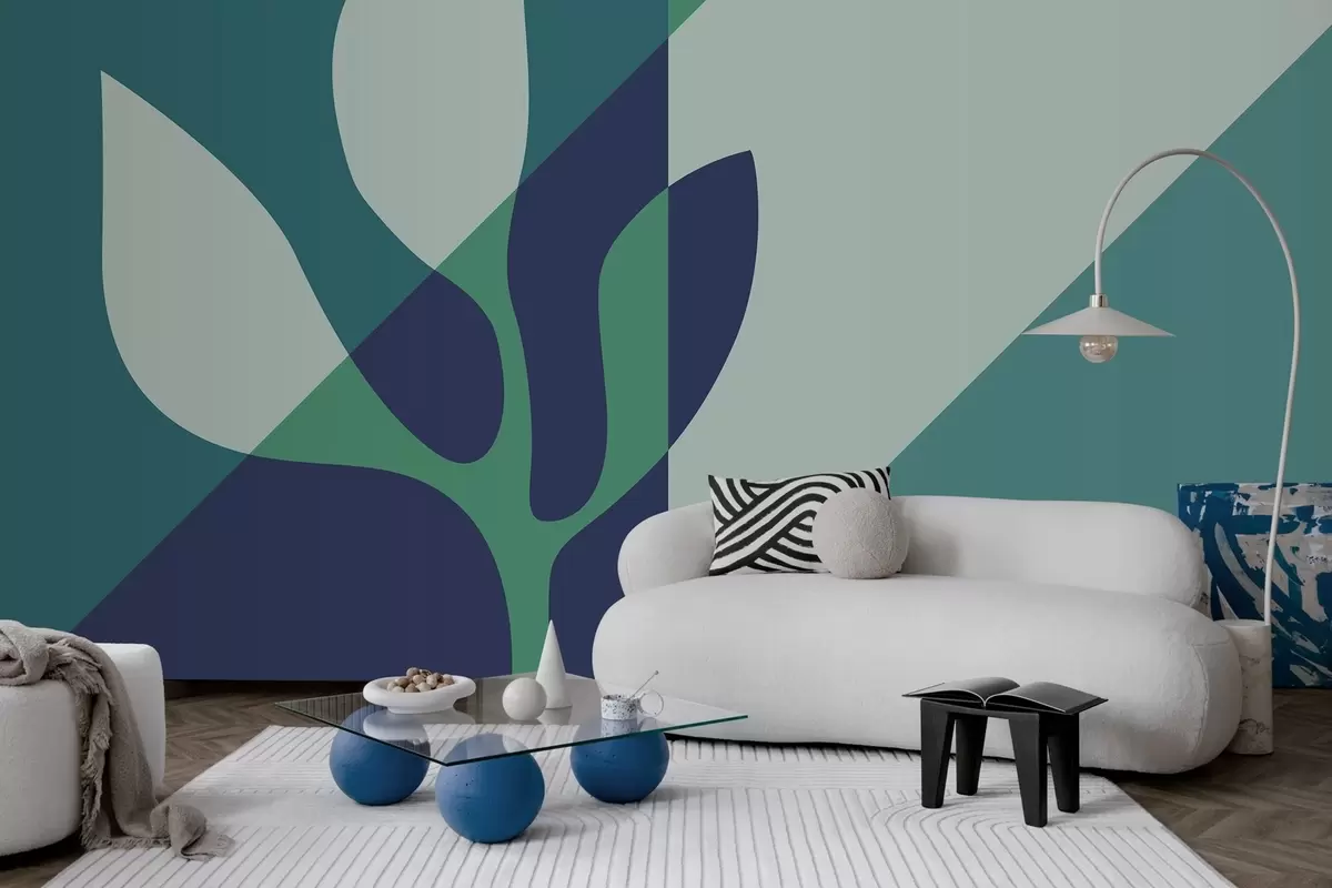 Wall murals abstract graphic plant on the background of geometry in blue tones Nr. w04028v1