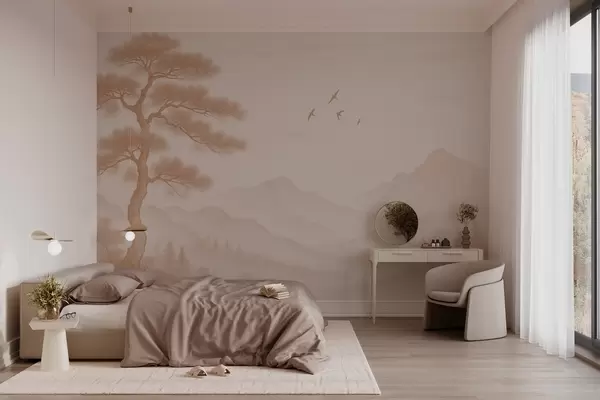 Wall murals panorama of hills with a large tree in mocha shades Nr. w04033v1