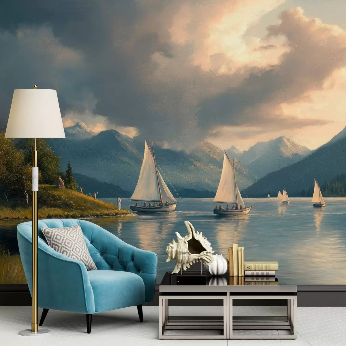 Wall murals regatta on a lake with a cloudy sky in the style of a 19th century oil painting Nr. w04076