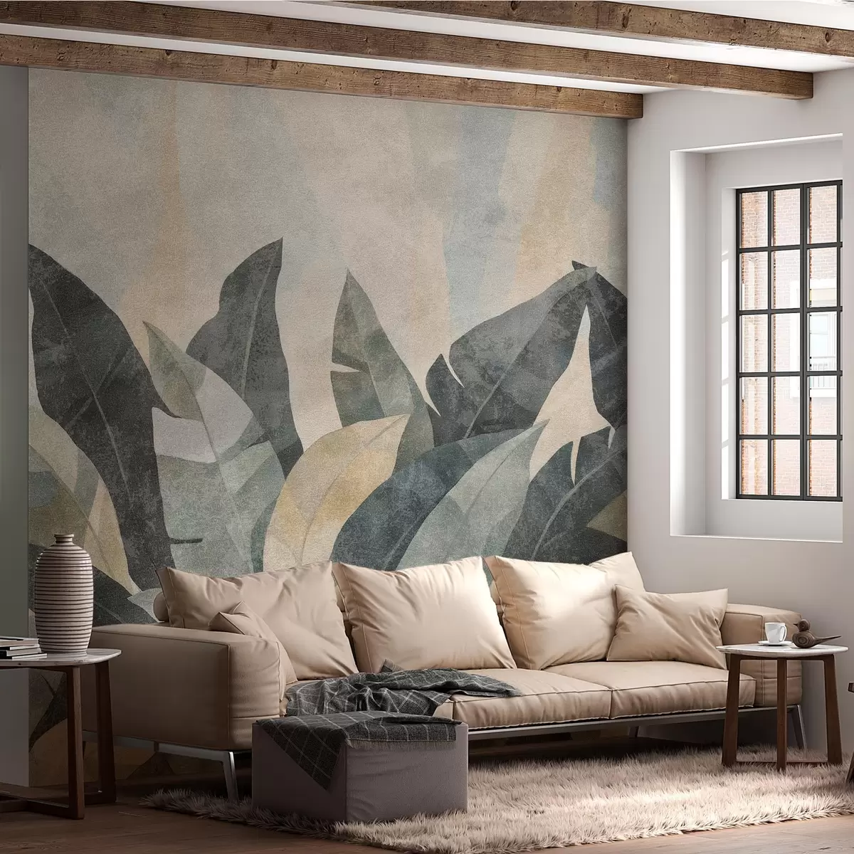 Wall murals textured banana leaves in natural shades of beige, green and gray Nr. w04285