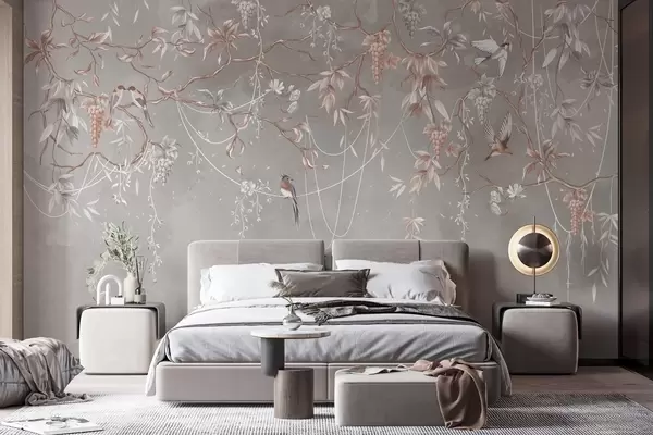 Wall murals Branches with grapes and birds on warm gray-pink background Nr. w04302