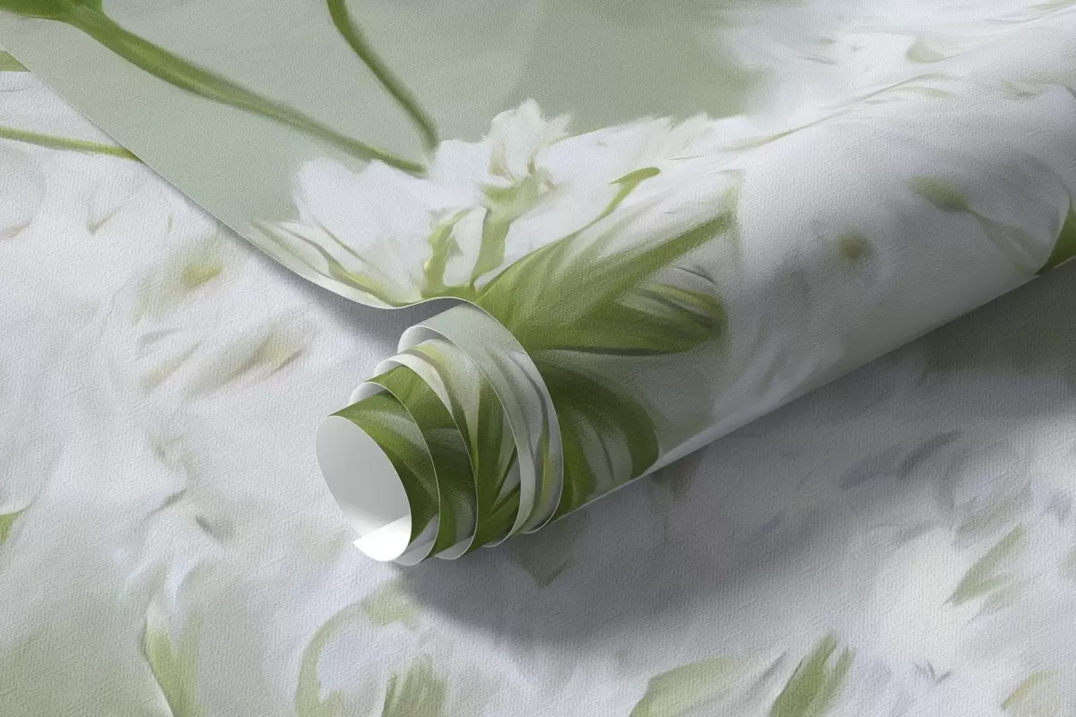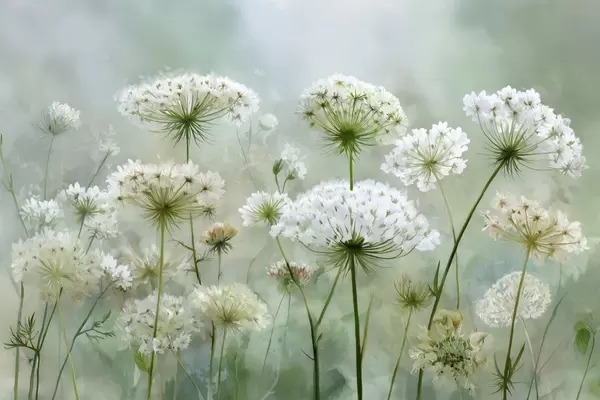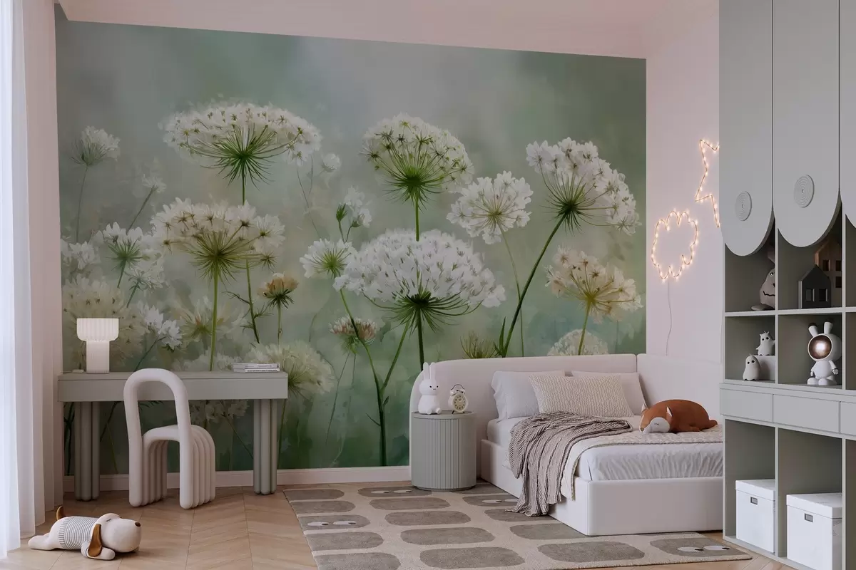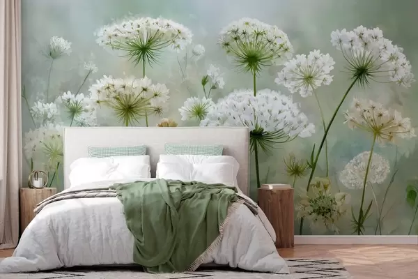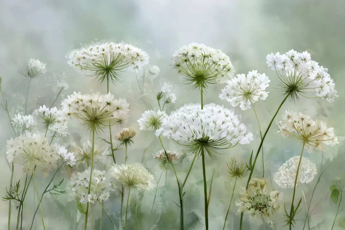 Wall murals delicate white wildflowers Queen Anne, in a picturesque style, green tones Nr. w04313
