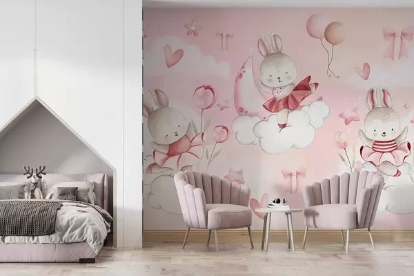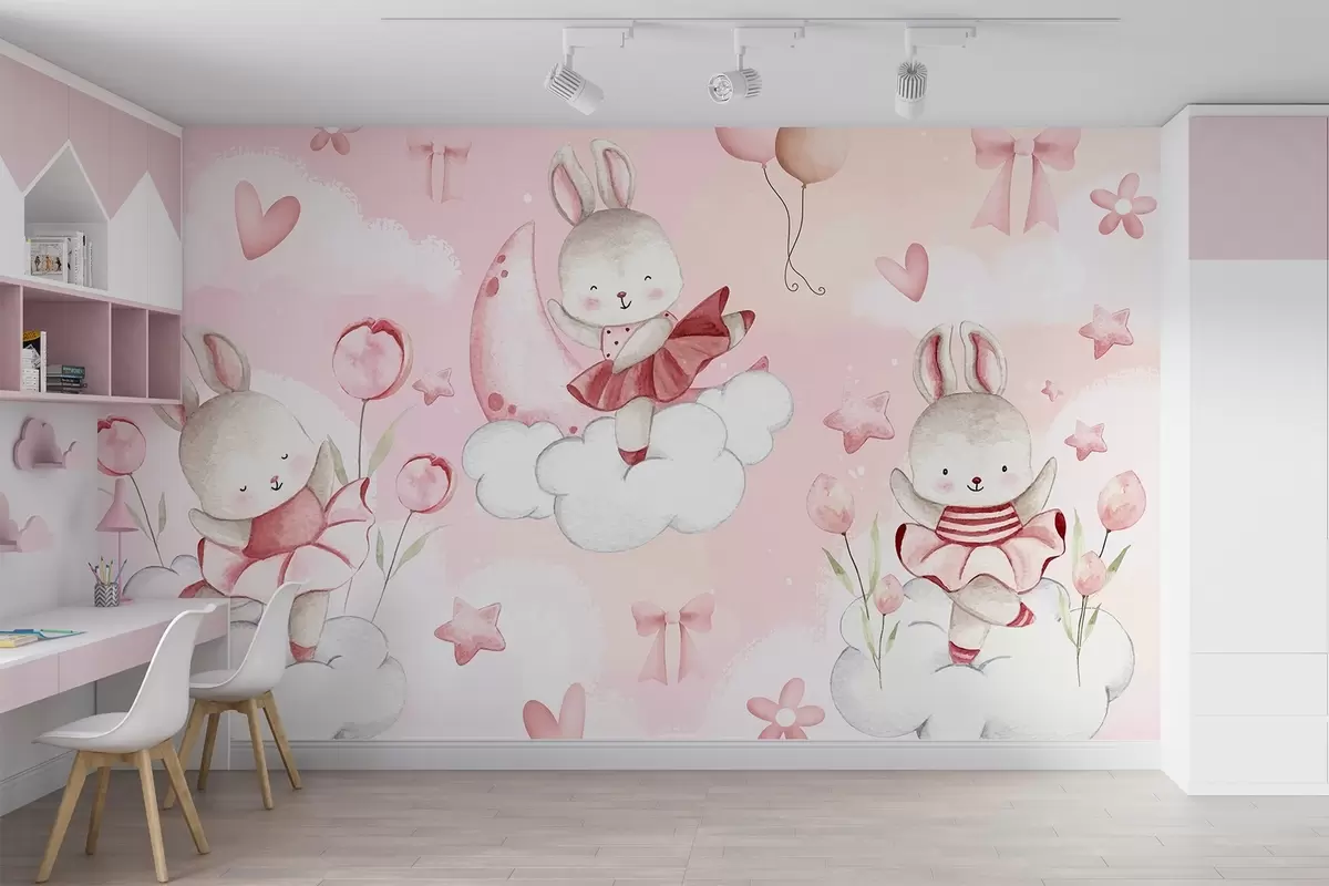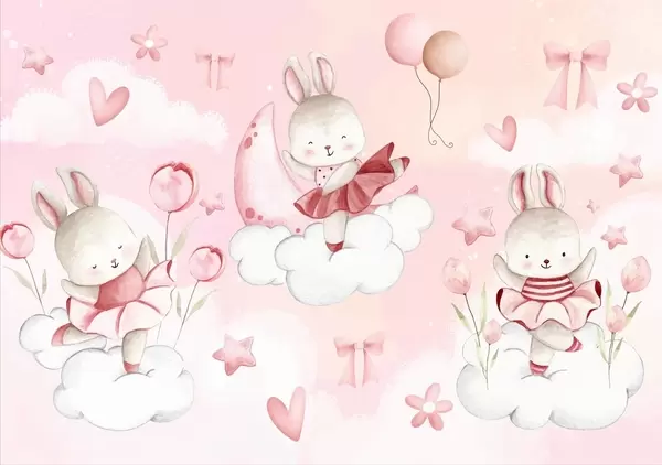 Wall murals Rabbits in pink ballet dresses on clouds Nr. w04333