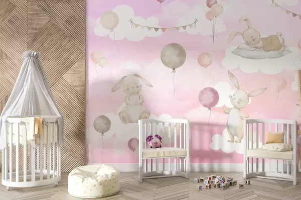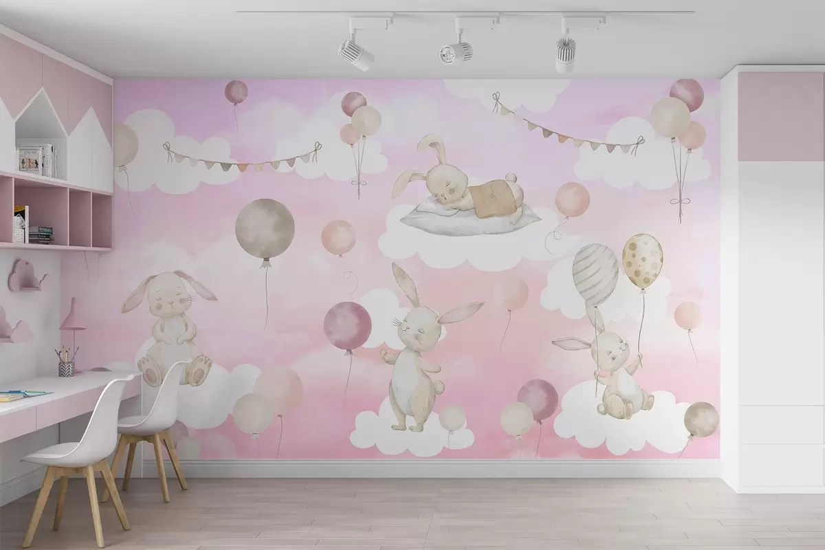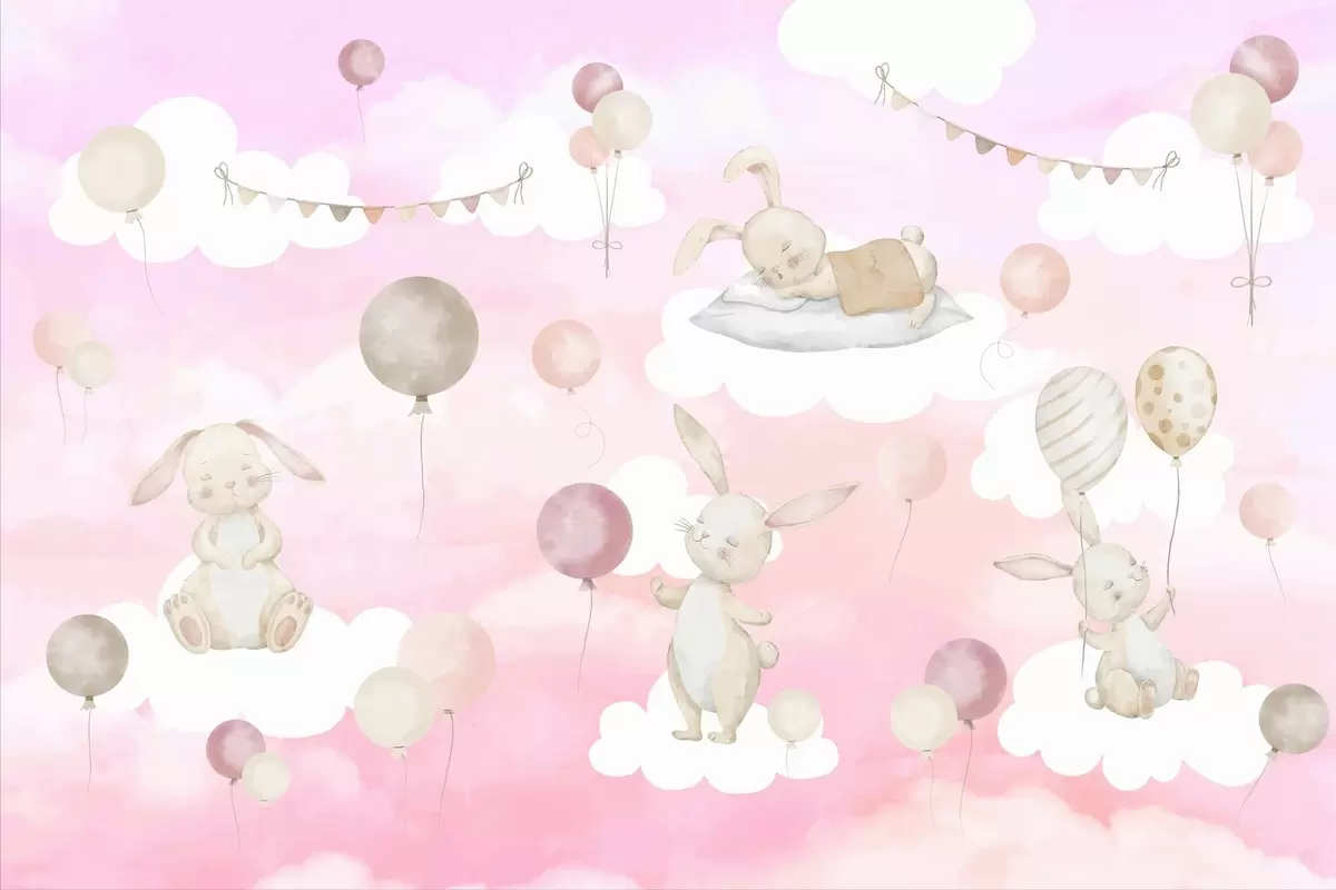 Wall murals Rabbits with balloons on clouds Nr. w04337v1