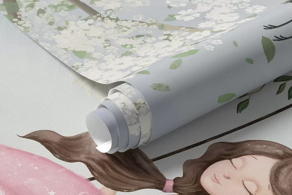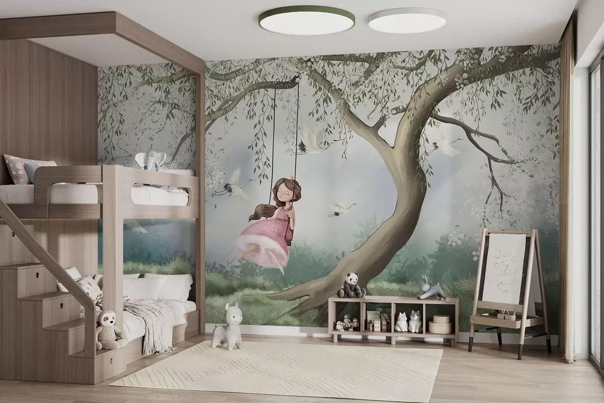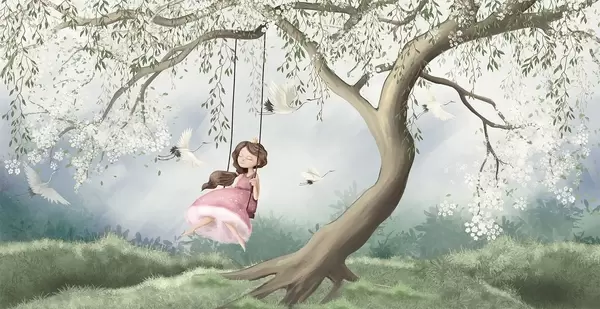 Wall murals Girl on swing under blooming tree with birds flying around Nr. w04370