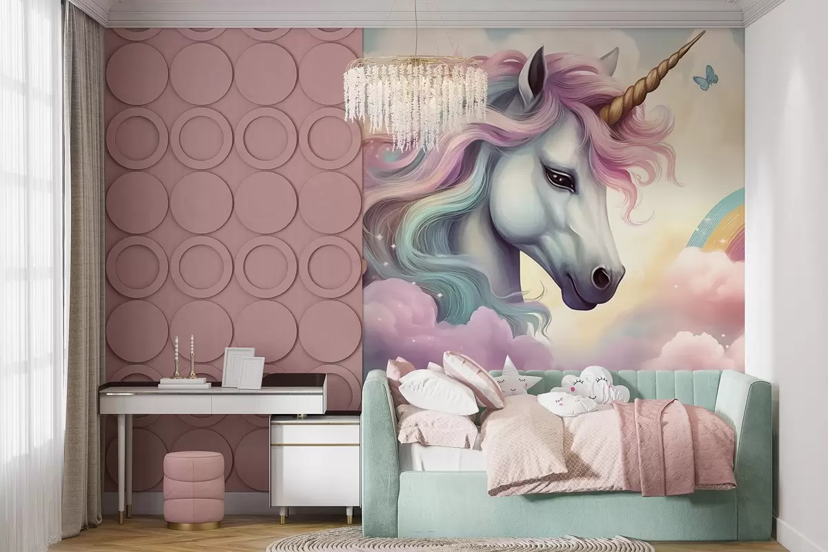 Wall murals Unicorn in a cloudy sky with a rainbow Nr. w04372