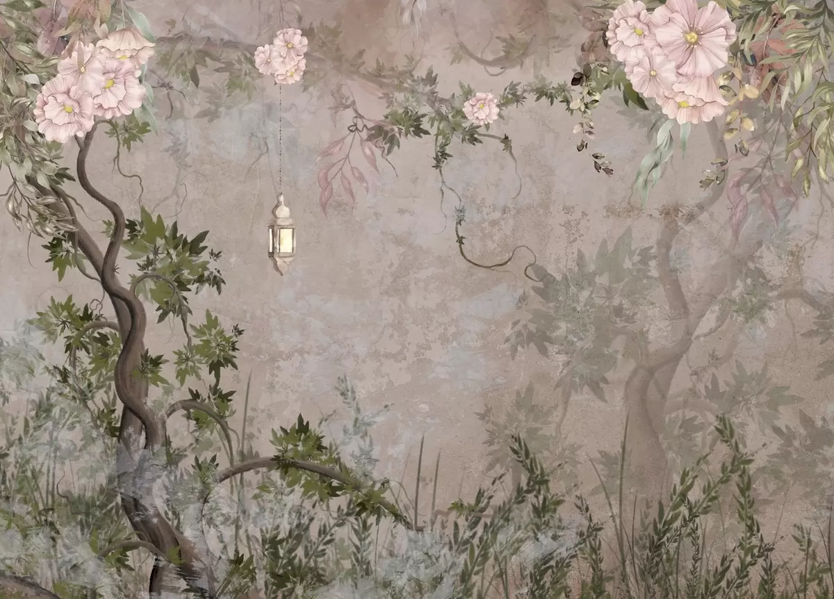 Wall murals Fairy garden with flowers, trees and lantern Nr. w04416