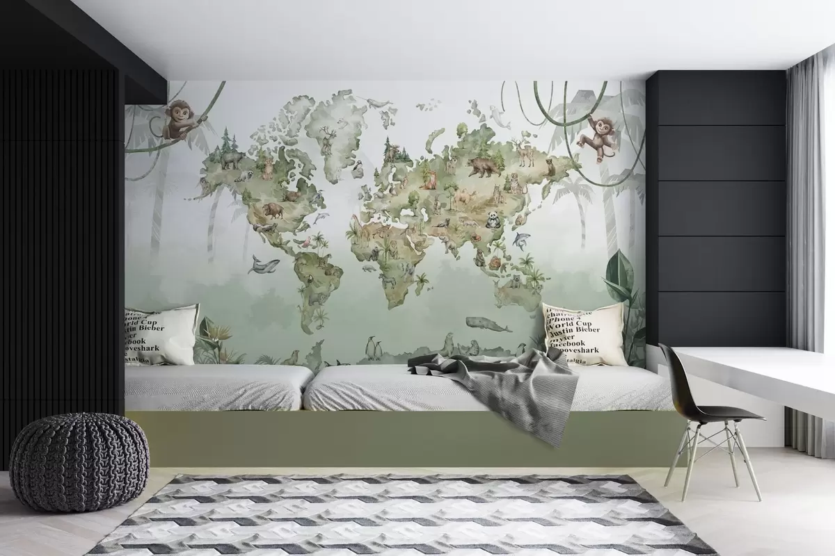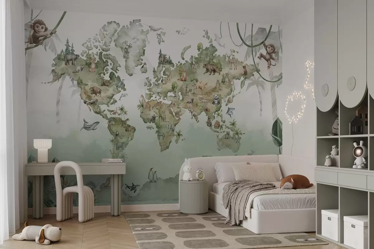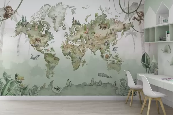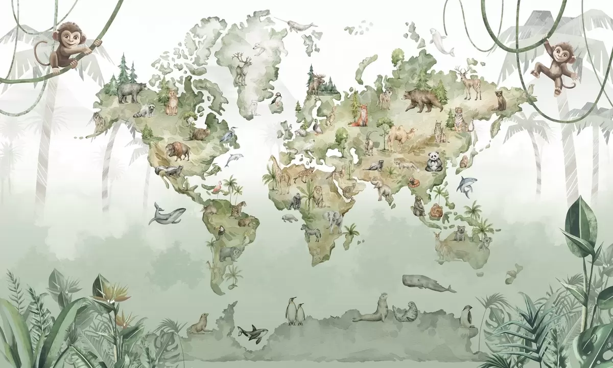 Wall murals Watercolor-style world map with animals Nr. w04418