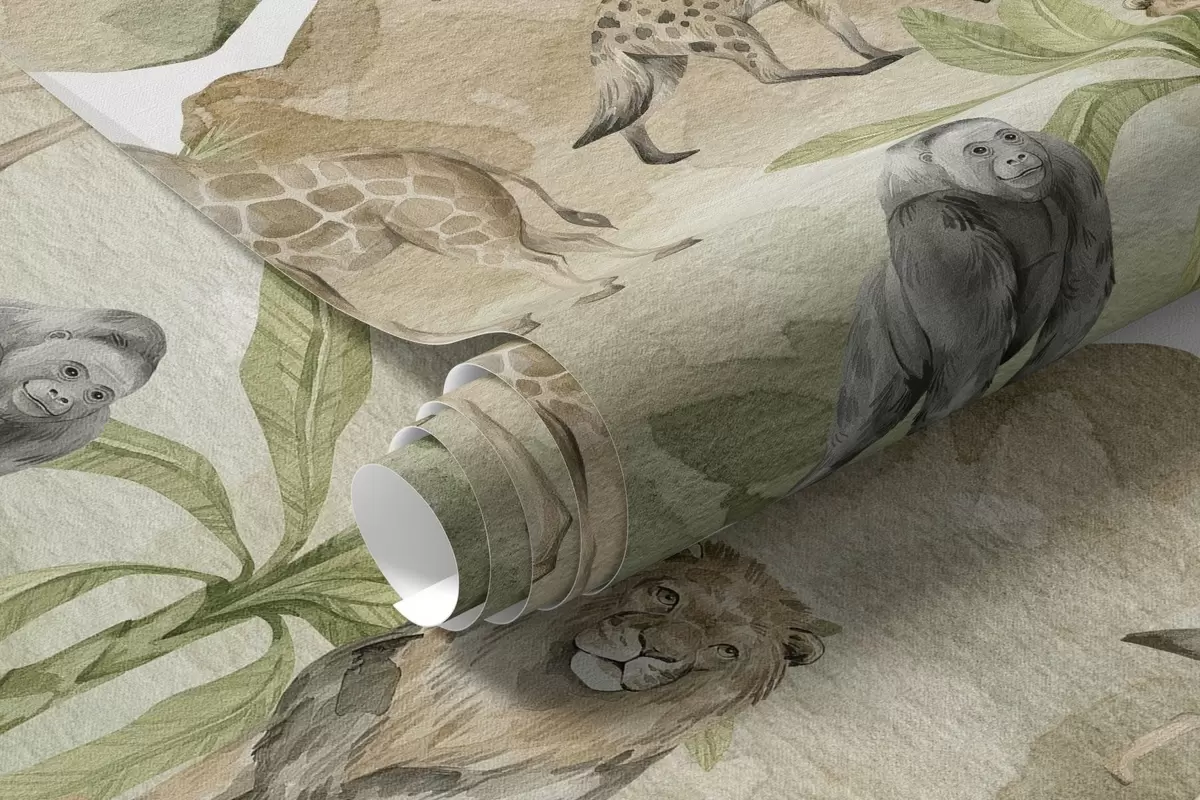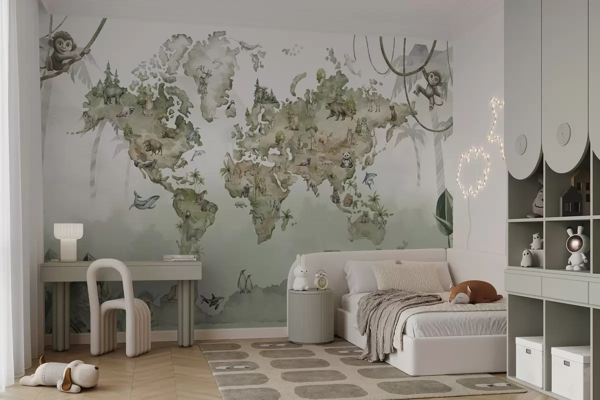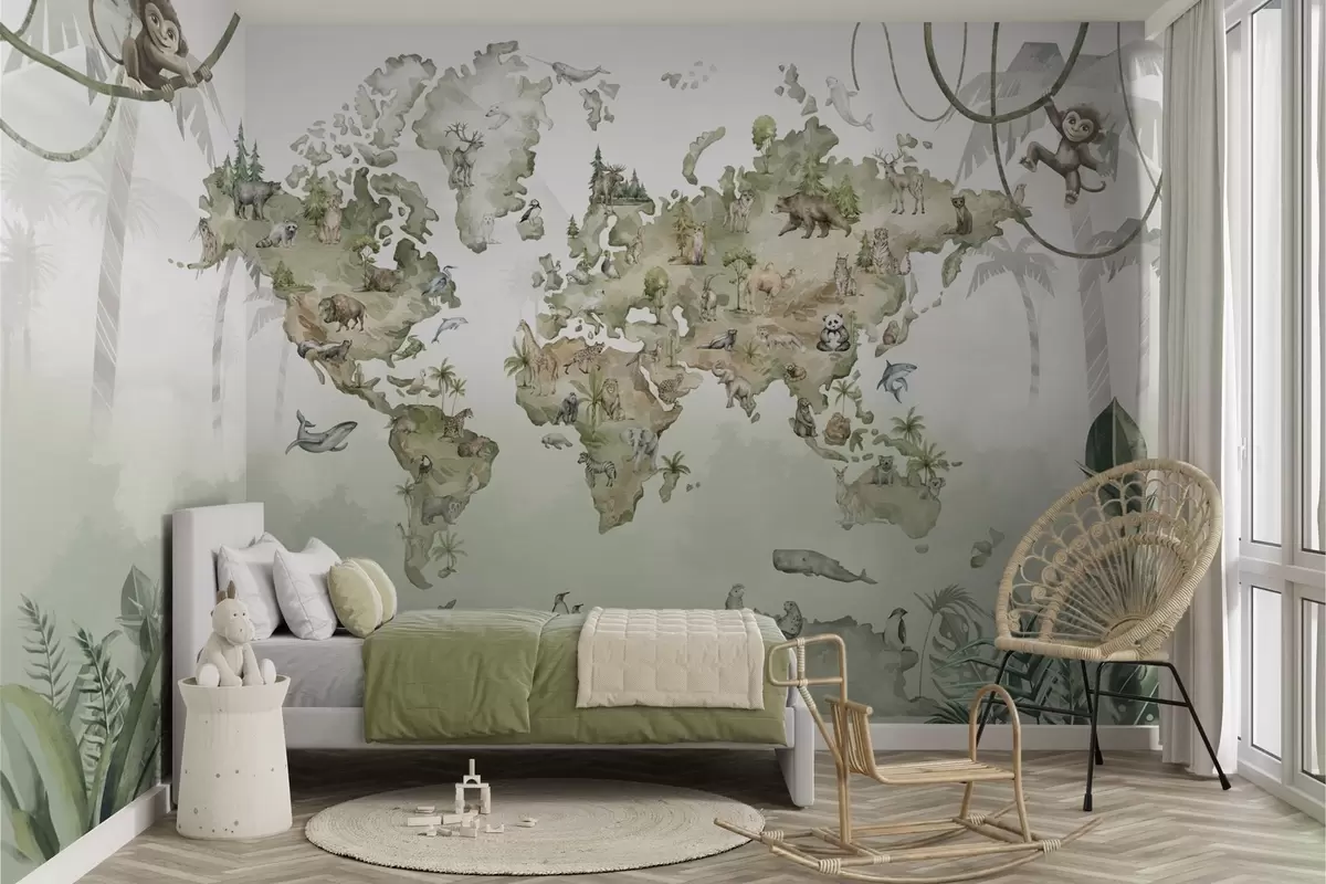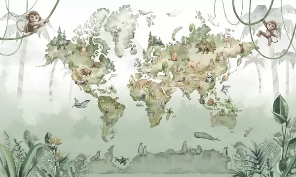Wall murals Illustrated world map with animals and jungles Nr. w04418v1