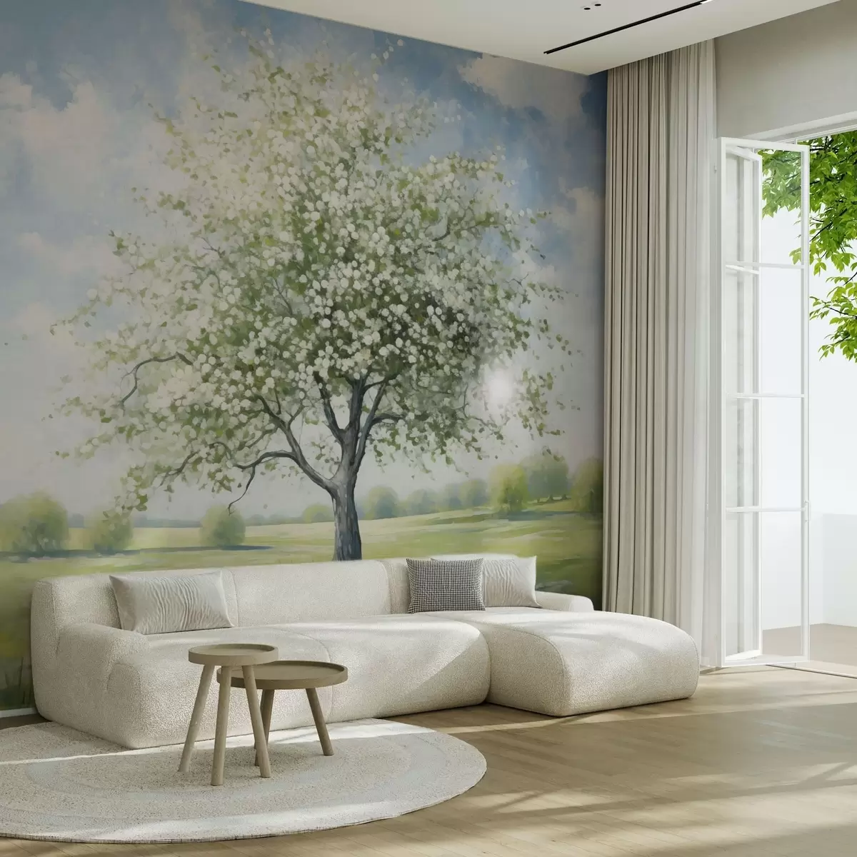 Wall murals A lone tree in a field with white flowers Nr. w04445