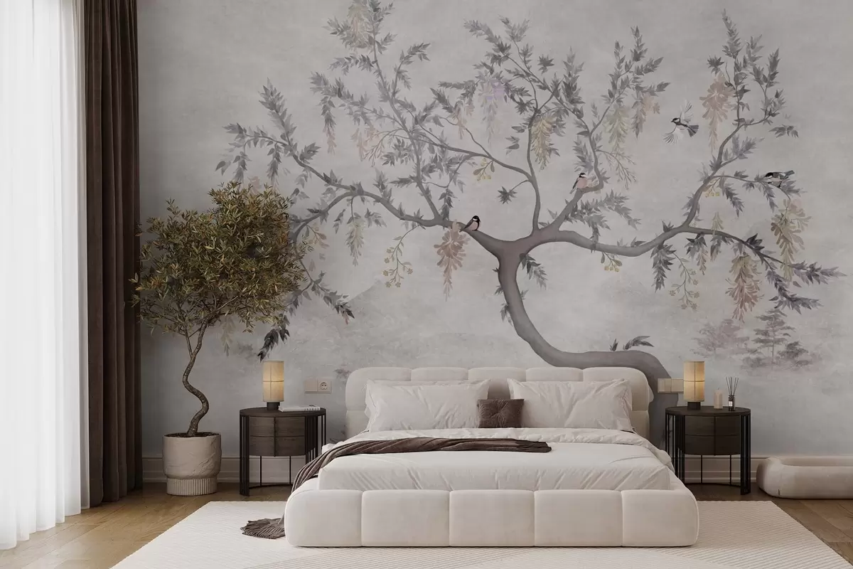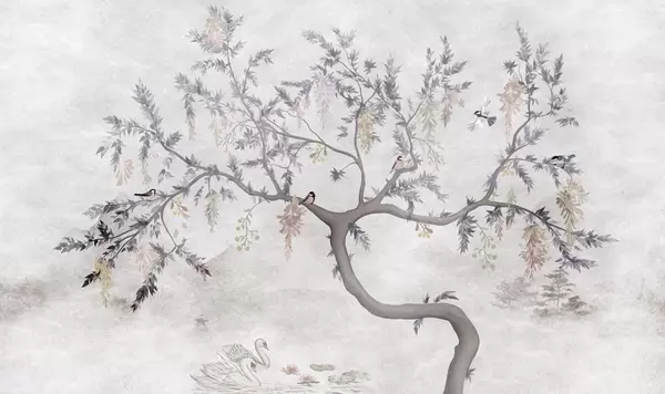 Wall murals Tree branch with birds in oriental style Nr. w04456