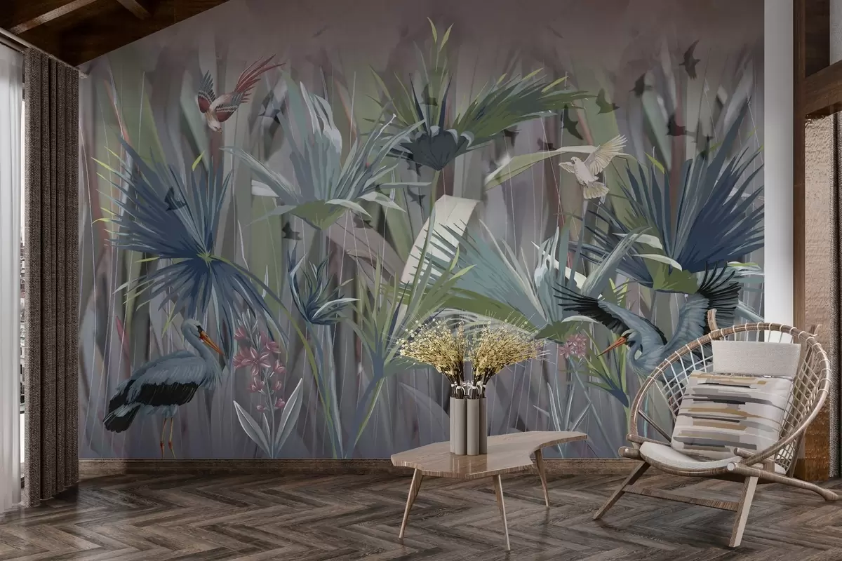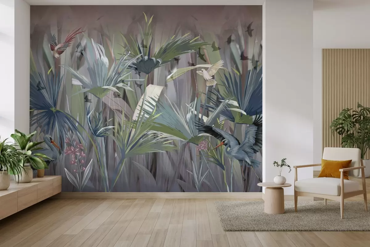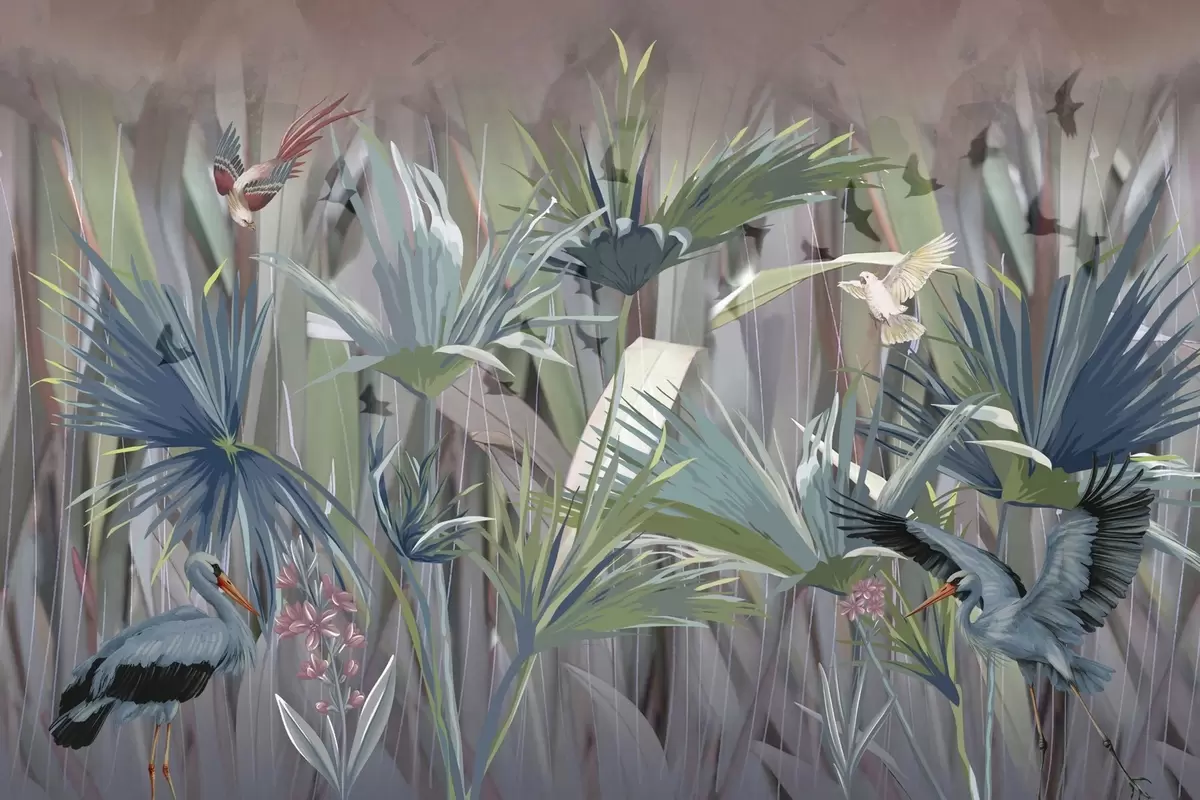 Wall murals Exotic birds among palm leaves and flowers Nr. w04458